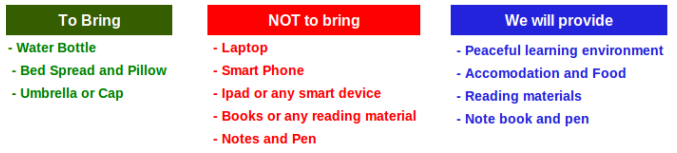 PS : You are allowed to bring basic phones. In case if you are bringing smart phones you are not allowed to use it during the class timings (9:00AM to 6:00PM)